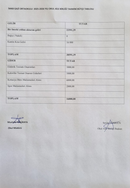 İmkb Gazi Ortaokulu 2025-2026 yılı okul aile birliği tahmini bütçe tablosu